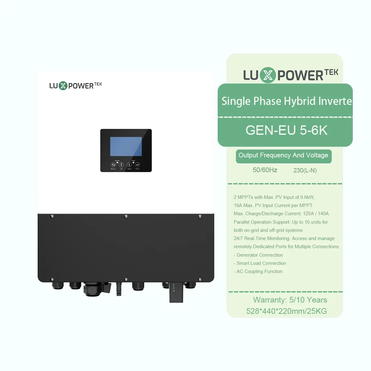 नवीनतम LUXPOWER GEN2-LB-EU 3-6K GEN-LB-EU 3-6K के लिए प्रत्यक्ष अपग्रेड है, जो बेहतर प्रदर्शन और लचीलापन प्रदान करता है। दोहरी एमपीपीटी ट्रैकर्स की विशेषता, यह 9.6kW अधिकतम पीवी इनपुट के साथ सौर फसल को अधिकतम करता है। प्रत्येक MPPT 18A का समर्थन करता है, एक विस्तृत 100-530V इनपुट रेंज में कुशलता से काम करता है।
