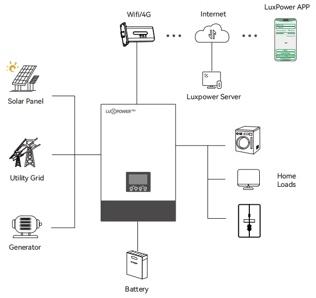 LUXPOWER SNA6000 ऑफ-ग्रिड इन्वर्टर डीसी-डीसी कनवर्टर सिस्टम का समर्थन करता है, जो विश्वसनीय बैकअप पावर या डीजल जनरेटर प्रतिस्थापन के रूप में सेवा करता है। समानांतर कार्यक्षमता के साथ, सिस्टम क्षमता 6kW से 96kW तक। इन्वर्टर डीसी-डीसी कनवर्टर वर्किंग मोड का समर्थन करता है: