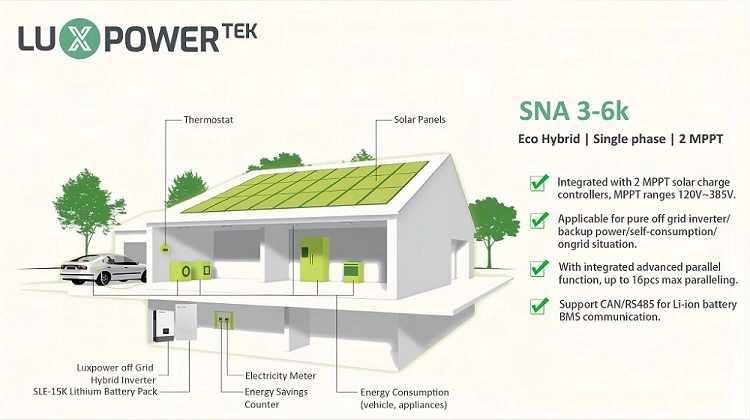 Sunlink की LuxPower SNA 6000 आपके घर के लिए निर्बाध शक्ति सुनिश्चित करती है, चाहे वह ग्रिड से जुड़ी हो या नहीं।
