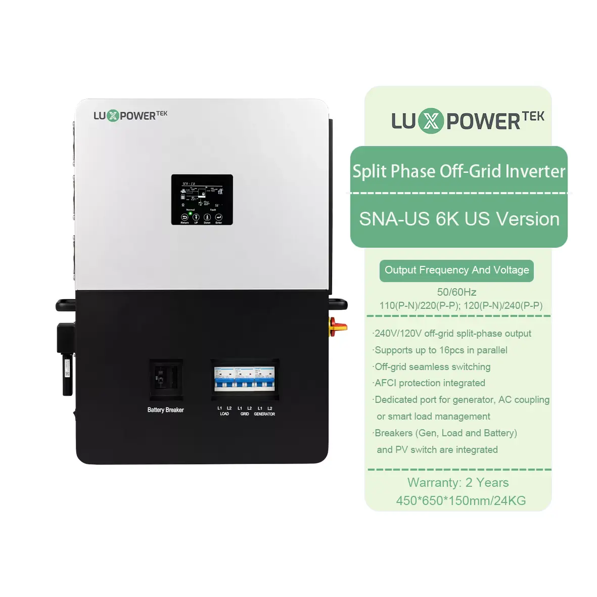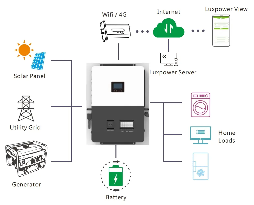 ऑफ-ग्रिड एनर्जी स्टोरेज के लिए डिज़ाइन किया गया, लक्सपावर एसएनए यूएस 6000 में एक समर्पित जनरेटर इंटरफ़ेस और 6KW आउटपुट पावर के साथ एक ईपीएस इंटरफ़ेस है।
